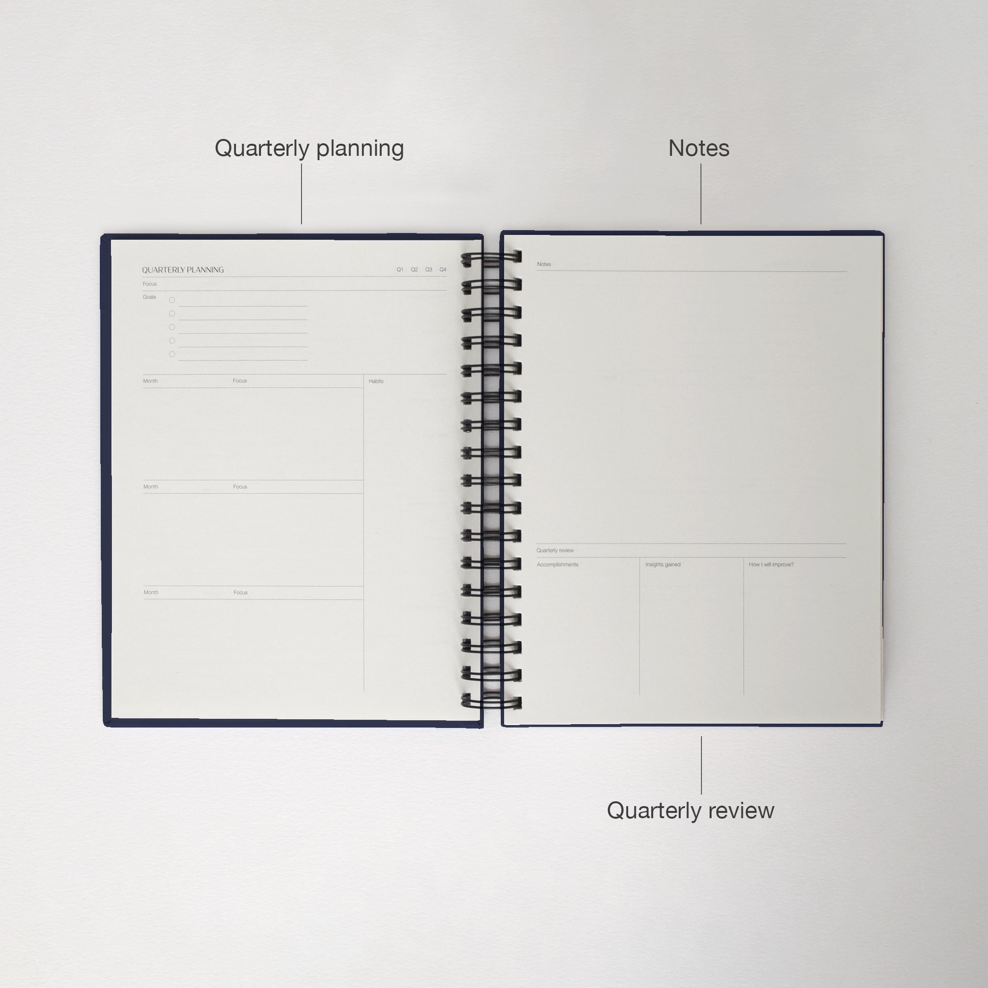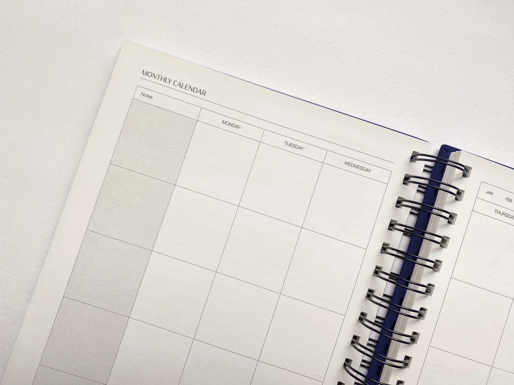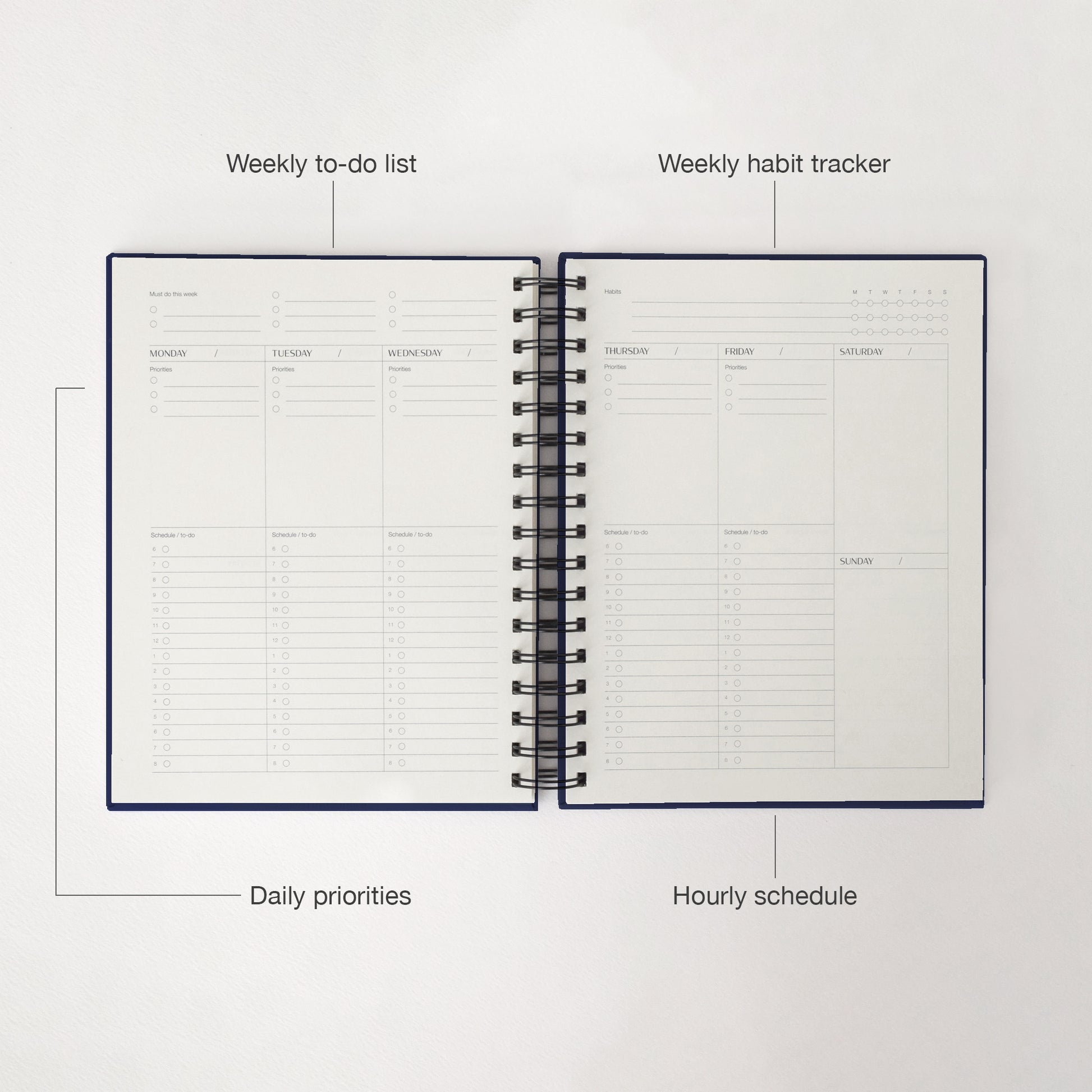 Our planner is a perfect choice for anyone who demands both style and functionality. The planner features a cloth-coated cover, durable coil binding, and 80-lb. paper that resists ink bleeding.